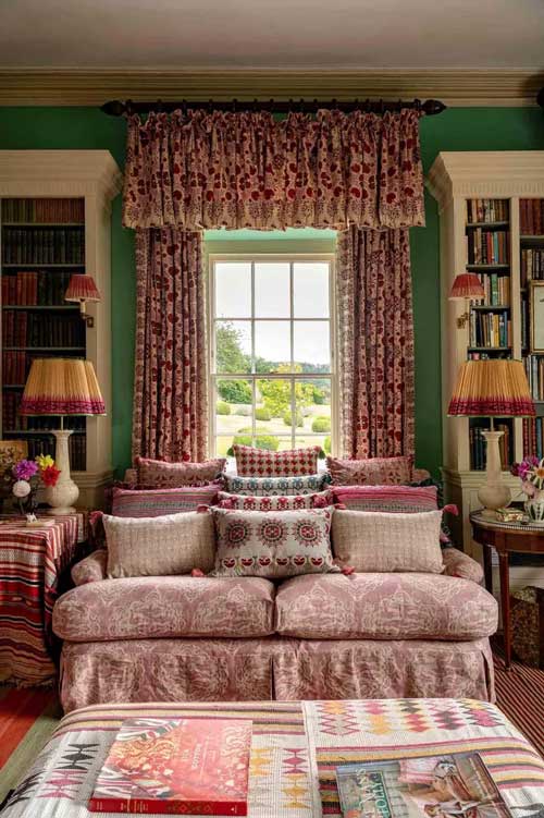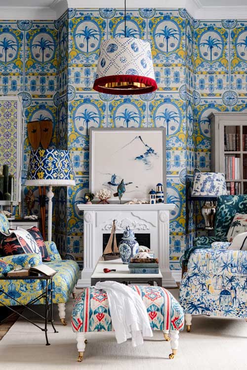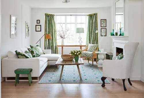 يمكن أن يكون الطابع العام لغرفة الجلوس مزخرفا وملونا نتيجة وجود بعض الاقمشة الملونة المستخدمة بالأرائك أو الستائر، لكن يجب أن يشمل ذلك الاضاءة ايضا. في هذا التصميم مثلا ينعكس اللون الجميل للستائر ذات اللون الاخضر الذي يشبه لون الببغاء والازرق النيلي والأبيض الفاقع على الجدران الخضراء والثريا البيضاء الشفافة.