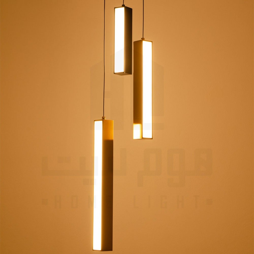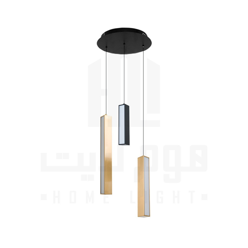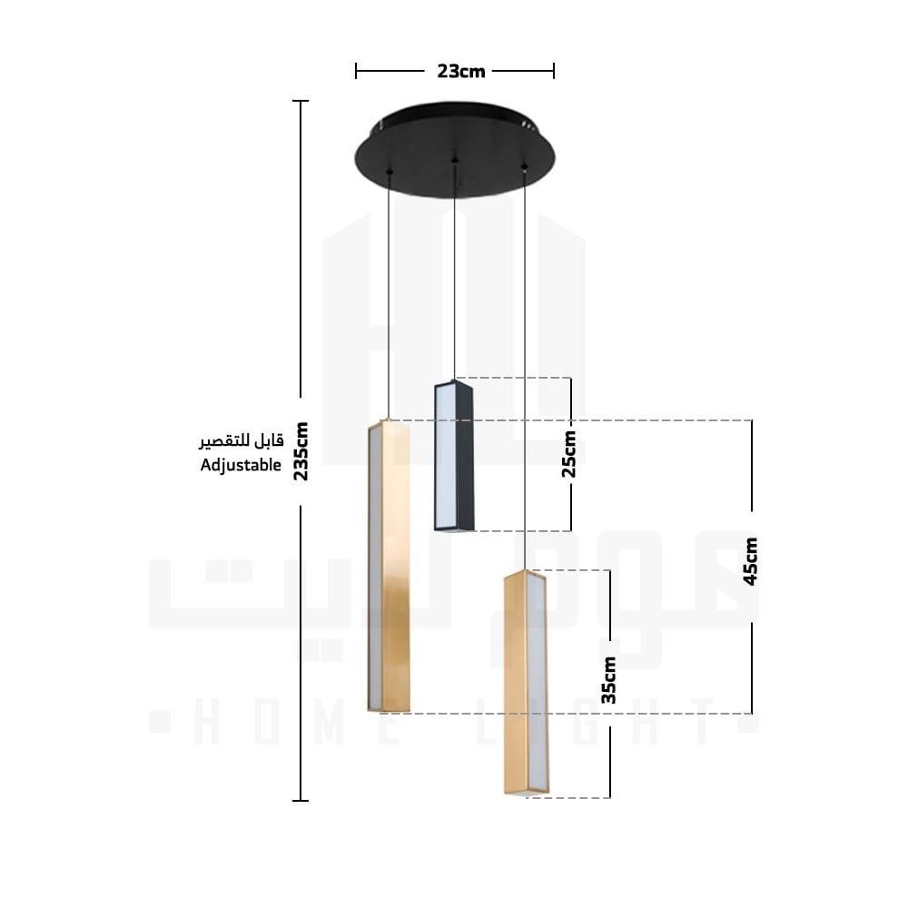 ثريا مودرن ثلاثيةاضاءة مدمجة LEDخامة المنتج : معدن الالمنيوماللون : اسود و نحاسياقصى طول للثريا 235 سم قابل للتقصيراضاءة من الامام و الخلف لكل رأس